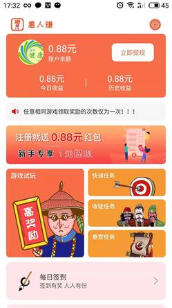 惠人赚app是一款专注于游戏试玩挂机自动赚钱的APP。惠人赚是贵州书辉文化传媒有限公司旗下的一款游戏试玩APP。试玩游戏,享受游戏的乐趣 ,赚钱零花钱,利用闲时间赚钱。随手做几个任务,新手一元提现,随时可提现。