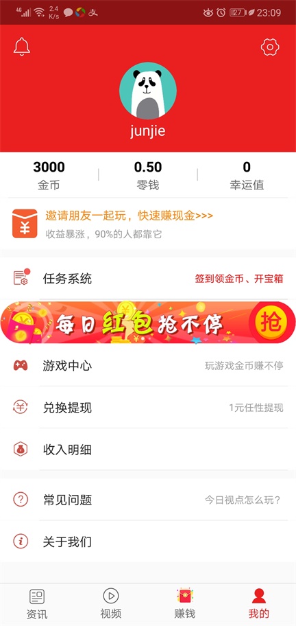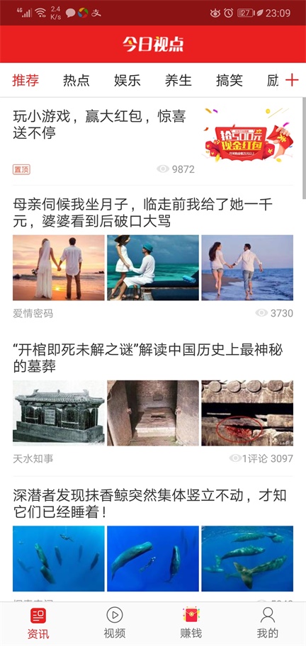 今日视点,每天看新闻看资讯,收获知识还能赚零花钱,在家兼职赚钱神器,一款自阅资讯赚钱平台,注册奖励1元,每日签到送100金币递增, 连续7天签到送100金币大礼包,每天邀请好友最高赚105元,自阅、分享、评论 、晒收入、分享收徒都有金币奖励!