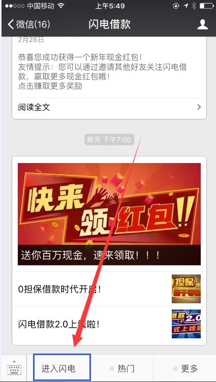 3、关注成功后,点击“进入闪电”,开始注册闪电借款。