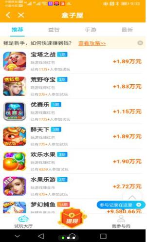 盒子屋是目前非常火爆的一个网赚平台,赚钱方法就是游戏试玩。平台为大家提供了成千上万款游戏,有热门游戏也有新出的游戏,类型也是多种多样,棋牌类养成类,策略经营类等等都能找到。当我们从中挑选出感兴趣的游戏后就可以点击进去看看这款游戏具体的赏金任务,也就是我们在游戏试玩过程中需要达到的奖励要求,然后下载游戏开始试玩,按照要求完成平台提供的游戏任务,最后回到平台领取对应的奖励金。盒子屋中每款游戏都有自己的赏金任务,随着游戏试玩的进行,需要完成的任务难度会越来越大但是每个任务的奖金会越来越多。