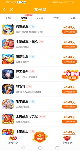 盒子屋中玩游戏赚钱,首先要学会在平台中如何玩游戏做任务。在“快赚”中就能很快学会平台中的游戏做任务赚钱的步骤。下载注册一款游戏后,根据游戏提示和任务要求就能完成任务。在游戏中完成任务要求后,平台就会发放任务奖励。